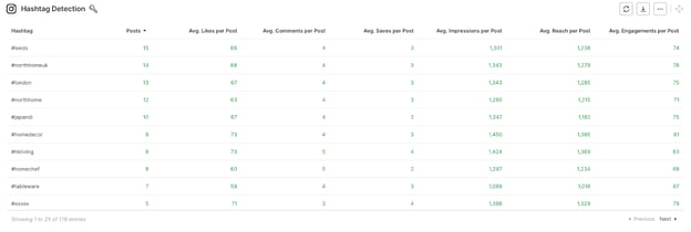The table shows how many times you’ve used each hashtag, and how much reach and engagement posts using those hashtags received.