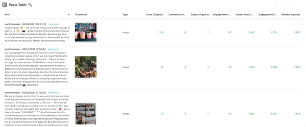 The Posts Table gives you a full breakdown of how each individual post performed, including likes, comments, saves, reach, and impressions.