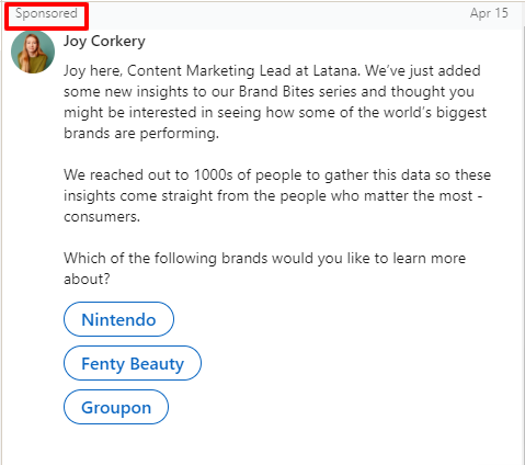 - Sponsored Inmail. These are ads in the form of messages delivered in your target audience’s inbox.